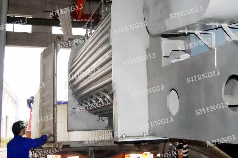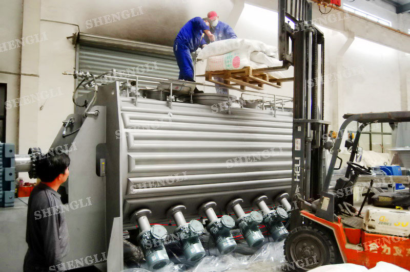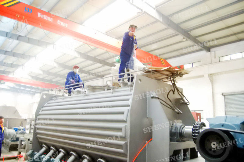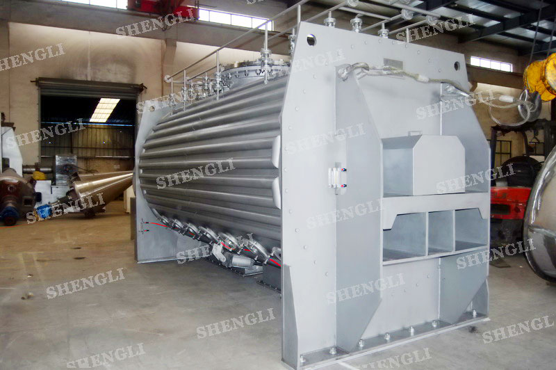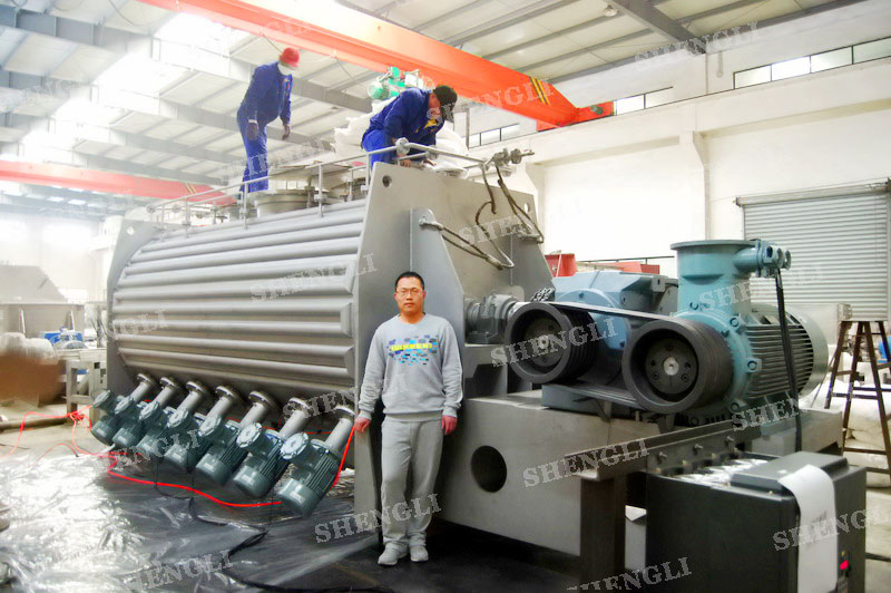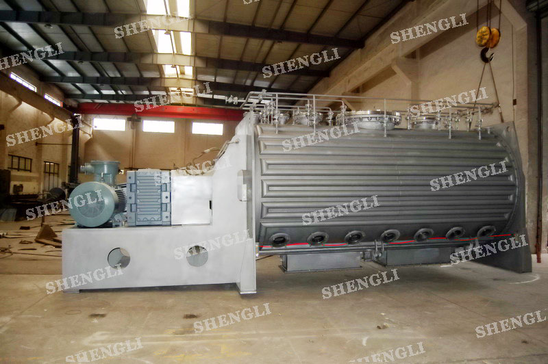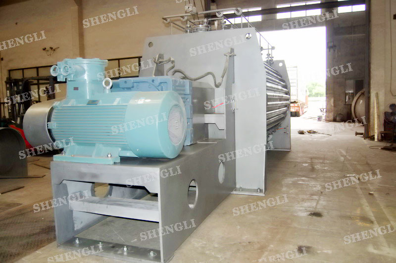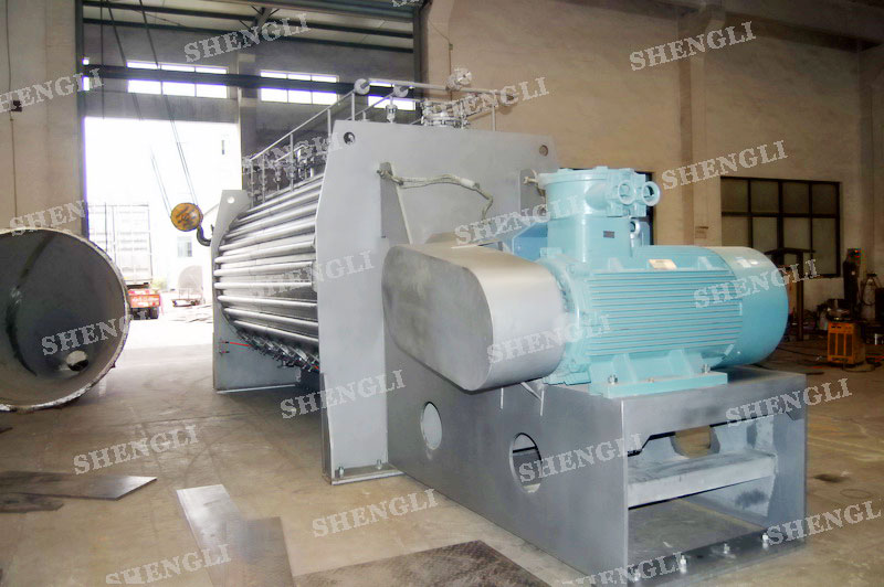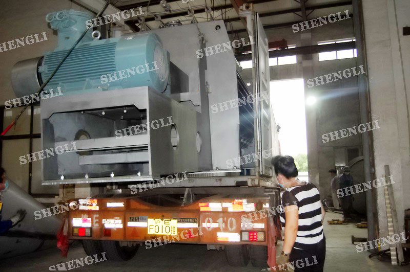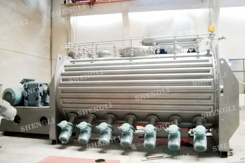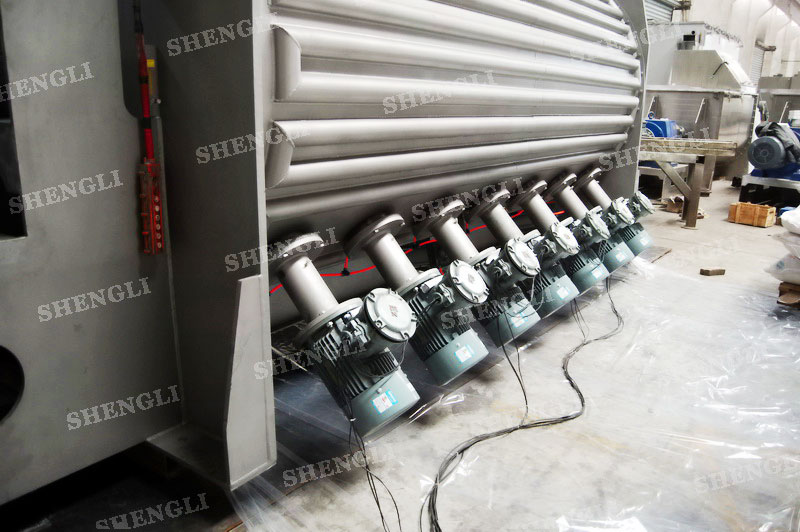 設備配置:配置K系列減速機,皮帶式安裝;搭載十四臺3000轉每分鐘的高速飛刀;筒體外設導熱介質盤管夾套;出料口采用雙氣動翻板閥;主軸與飛刀主軸采用氣密封;設備架設多組噴液系統(tǒng);筒體上設氣動在線取樣閥;設備內表面鏡面拋光、外表面噴砂亞光。
