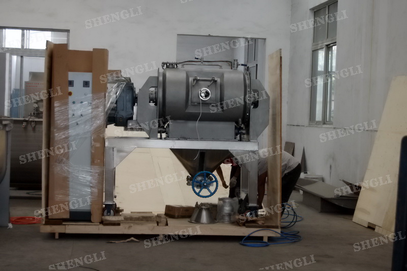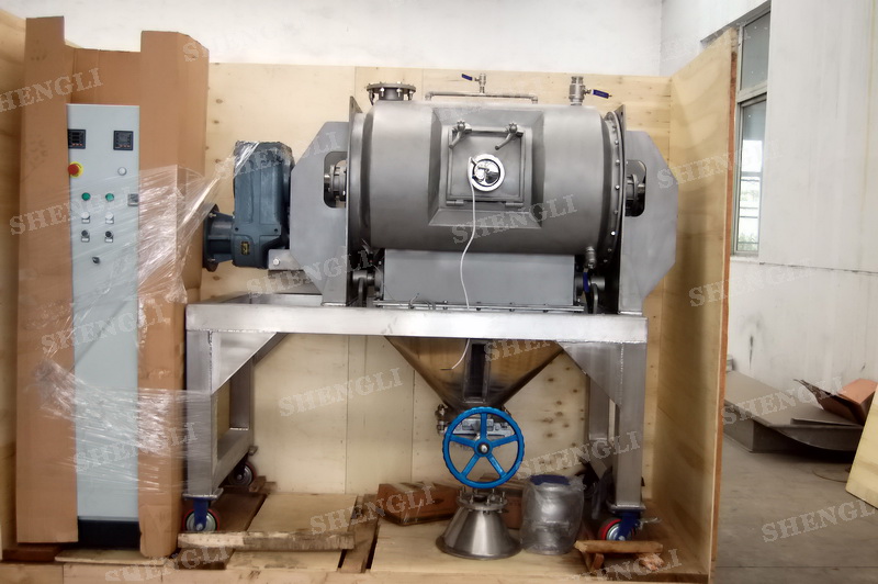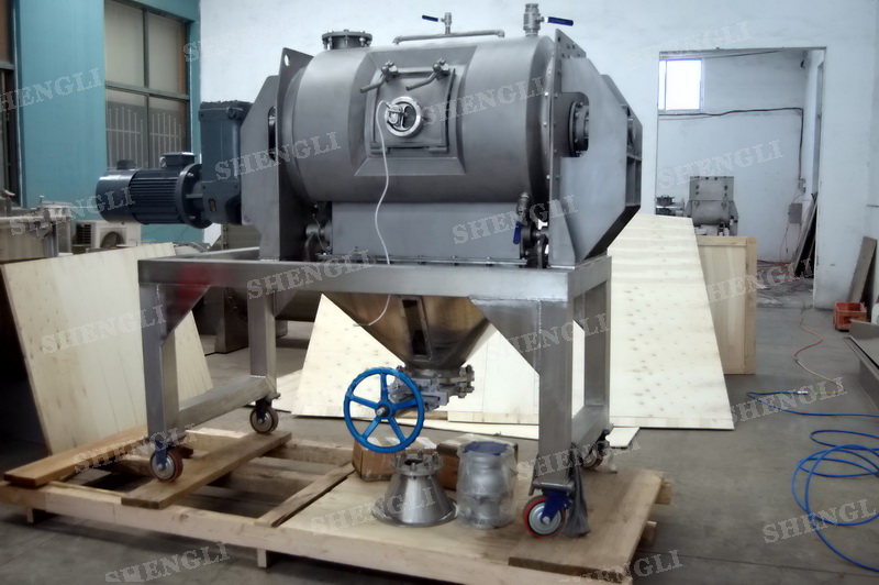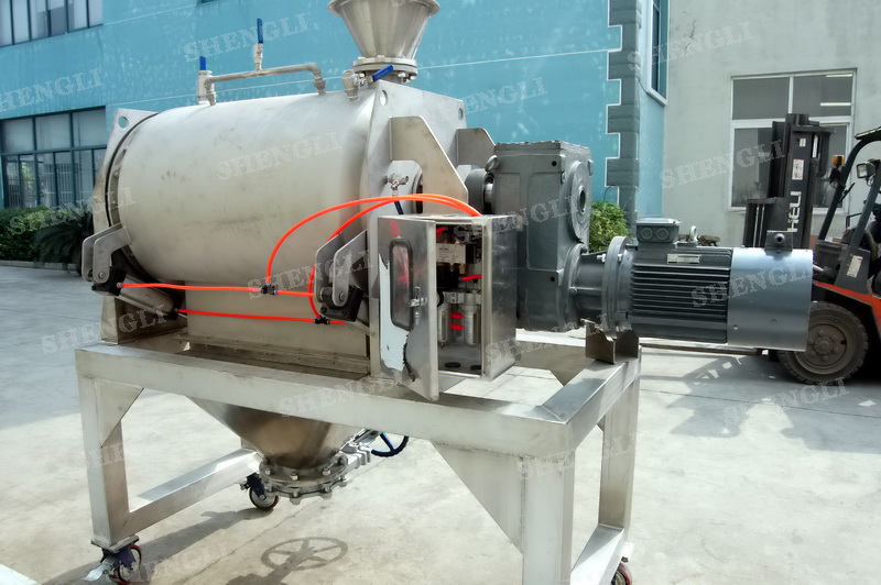 設備配置:配置F系列減速機,平行安裝;筒體外設導熱介質夾套;開設快開式檢修門;出料口采用氣動翻板閥;設備主軸采用氣密封;筒內設加液噴頭;設備內表面鏡面拋光、外表面噴砂亞光。