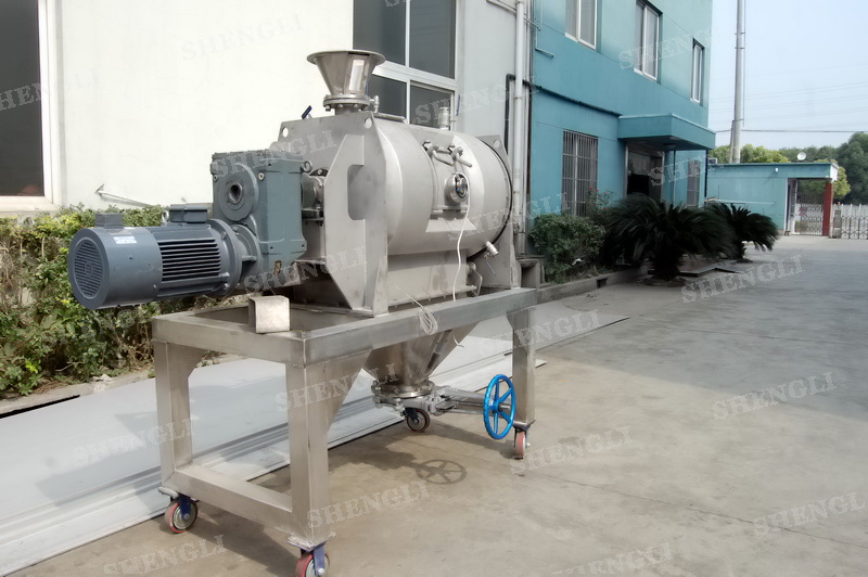 工作原理:犁刀式攪拌機采用臥式圓柱筒體,內設平行主軸,主軸上安裝若干犁式刀頭,通過較快的旋轉速度,分割、重合物料,實現快速攪拌的功能,常結合1500-3000轉高速剪切飛刀相互作用。