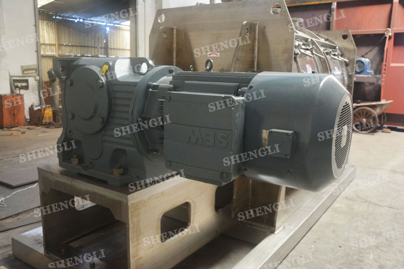 工作原理:臥式犁刀攪拌機采用臥式圓柱筒體,內設平行主軸,主軸上安裝若干犁式刀頭,通過較快的旋轉速度,分割、重合物料,實現快速攪拌的功能,常結合1500-3000轉高速剪切飛刀相互作用。