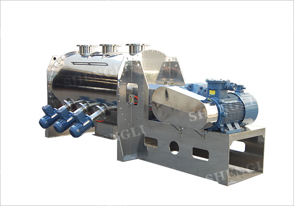 犁刀式混料機(jī)為單軸式強(qiáng)制攪拌設(shè)備,主軸上安裝有多組犁刀式攪拌器,并且錯(cuò)位連續(xù)安裝,結(jié)構(gòu)上避免了攪拌死角,運(yùn)轉(zhuǎn)時(shí),更產(chǎn)生了不間斷式的漩渦離心作用力,錯(cuò)位的犁刀持續(xù)攪拌,漩渦離心物料流不斷重疊、擊散,致使物料沸騰,并行成對流循環(huán),快速的攪拌物料。 結(jié)團(tuán)性物料如纖維或受潮結(jié)團(tuán)、加液凝聚的粉料,通過在犁刀混料機(jī)內(nèi)安裝的高速飛刀,結(jié)合犁刀攪拌器攪拌物料時(shí)形成的對流循環(huán)作用,對結(jié)團(tuán)性物料進(jìn)行打散、分離。 高速飛刀安裝于犁刀混料機(jī)筒側(cè)向下45度角,刀頭伸入筒內(nèi),在攪拌時(shí),物料受犁刀驅(qū)趕至飛刀有效范圍,受飛刀高速剪切。